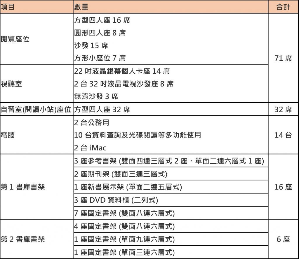 使用面積:圖書館94坪(CL329),自習室(悅讀小站)27坪(CL405),第2書庫及視聽室38坪(CL301)